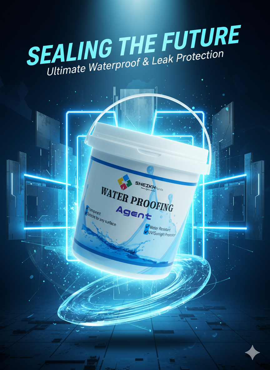 Sheikhpaints Waterproofing Agent keeps your home safe, dry, and protected. It forms a strong shield that stops water from leaking into roofs, walls, bathrooms, tanks, and basements.